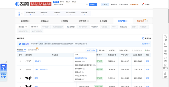 天眼查数据显示,截至7月27日,中国嵩山少林寺已注册的商标达795个,涉及珠宝、教育娱乐、服装鞋帽、方便食品、灯具、餐饮住宿等各种生意。